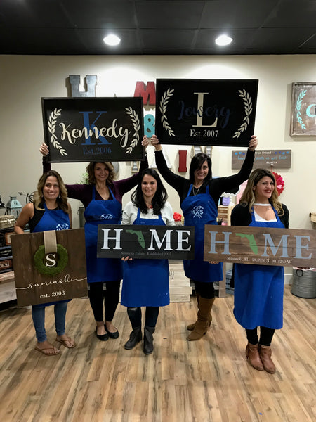 -You will arrive to find your pre-ordered wood and personalized vinyl stencil along with all your supplies, and an apron to protect your clothing.